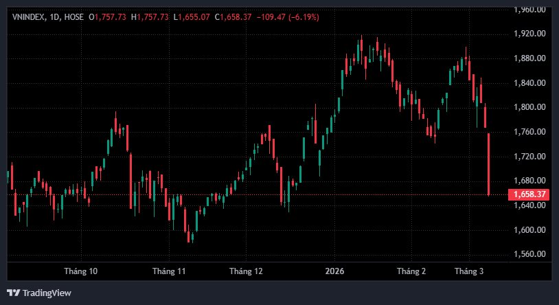 Tính đến 10h30p, VN-Index “bốc hơi” 110 điểm, tương đương gần 6,2%, lùi xuống 1.657 điểm - đánh dấu phiên giảm mạnh nhất trong lịch sử thị trường chứng khoán Việt Nam.