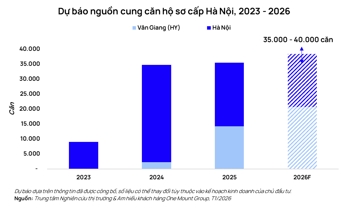 Dự báo trong năm 2026, thị trường căn hộ sơ cấp Hà Nội tiếp tục duy trì đà tăng trưởng tích cực với tổng số lượng căn hộ mở bán mới dự kiến khoảng 35.000–40.000 căn, tương đương hoặc cao hơn năm 2025, và cao vượt mức trung bình giai đoạn sau Covid-19. Trong đó, Văn Giang (Hưng Yên) dự kiến cung ứng khoảng 20.000–25.000 căn hộ mở mới, lần đầu tiên dẫn dắt nguồn cung nhờ sự hiện diện của các đại đô thị quy mô lớn như Vinhomes Ocean Park 2-3, Ecopark, Alluvia City và Sunshine Legend City.