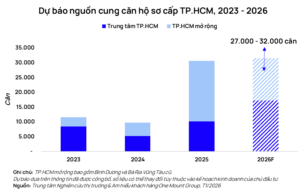 Tổng nguồn cung mới tại thị trường TP.HCM dự kiến sẽ đạt từ 27.000 đến 32.000 căn hộ mỗi năm. Trong đó, khu vực trung tâm TP.HCM ước tính đóng góp từ 16.000 đến 17.000 căn mỗi năm trong giai đoạn 2026 - 2027. Việc gia tăng đáng kể về cả số lượng và chất lượng nguồn cung sơ cấp cho thấy sự sẵn sàng của các chủ đầu tư trong việc đón đầu làn sóng tăng trưởng mới.
